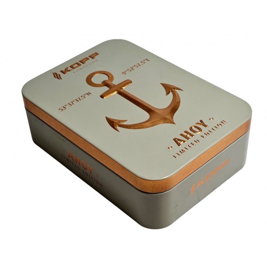 Intr-o cutie eleganta, decorata cu ancora, simbolul stabilitatii si permanentei, editia limitata Ahoy Anker 2026, este o reafirmare a Kopp Tobaccos, la originile sale din apropierea orasului port Hamburg.
